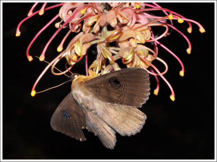 At night they can sometimes be seen nectaring, this one is feeding in Grevillea Coconut Ice.